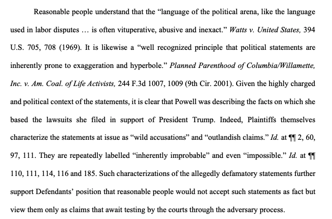 rank | Wed Mar 24 07:29:11 2021 so one of Trump's sleazebag lawyer's (Sidney Powell) is facing a large defamation suit from Dominion voting machines her defense appears to be that claiming Dominion voting systems were changing votes (& that numerous other countries in on it) was political hyperbole & that no reasonable person would believe it (thus not defamatory... no one distrusts Dominion now, right?)... & even though she was filing lawsuits on it... one notable page here: http://pbs...WQAEZ3a7?format=png&name=small so it seems one unreasonable person is MyPillow Guy oh... and who else was repeating her claims & inviting her to the White House... oh, the former so-called 'president' |