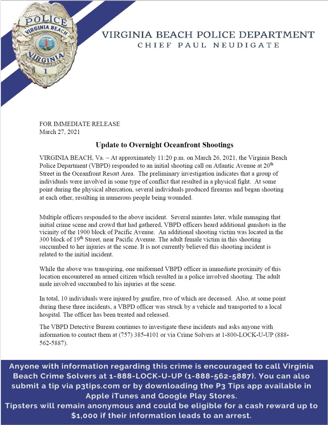 rank | Sat Mar 27 08:53:19 2021 VBPD is investigating a shooting involving several victims with possibly life-threatening injuries. Large police presence at the oceanfront between 17th and 22nd St. Please avoid the area at this time. More to follow as it becomes available. ~ Virginia Beach PD http://twitter.com/VBPD/status/1375678007956926466 |