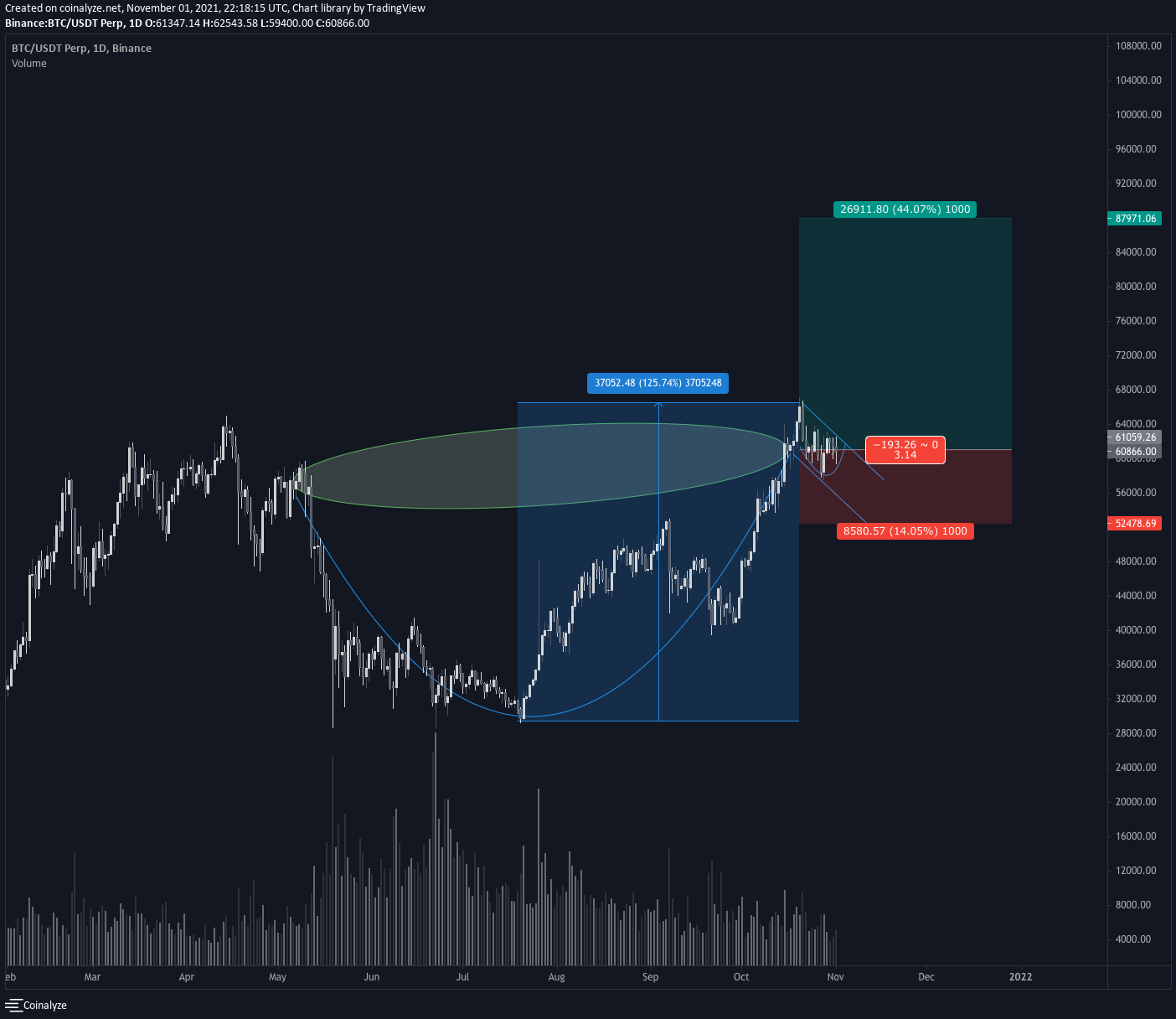rank | Tue Nov 02 00:23:29 2021 http://coinalyze.net/snapshot/OysrmIvs My technical views on Bitcoin. We could definitely have a bullish retest down the the 52-53K range, or the whales could say f*** it and send it while shorters are still greedy. Right now I'm leaning towards the latter. It's not a perfect U shape cup and handle, but it isn't a V shape either. It's somewhere in between. But these patterns are behavioral clues, anyways. The key to me is, 50% retrace, 100% rally, consolidation in a downwards channel. Combined that with on-chain metric (my favorite on-chain analyst is ecoinometrics), and I'm staying allocated. Not risking the chance of missing an early breakout, and, if it doesn't happen, the resulting rally will make up for it. Unless things turn bearish again. Never know. Just going off the chart, futures, and on-chain metrics for now. :) |