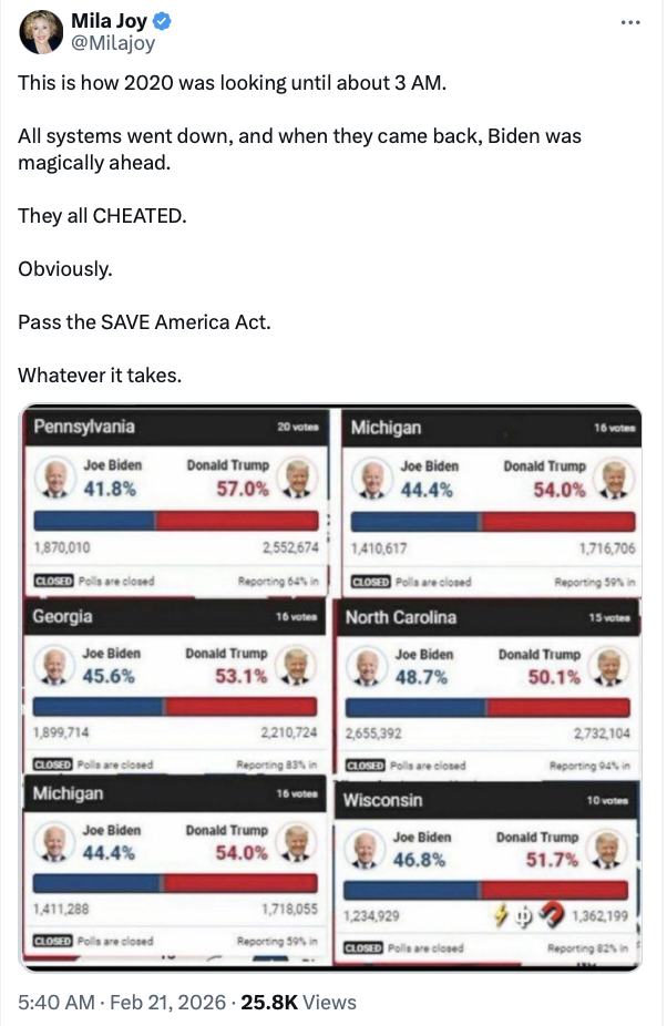 rank | Mon Feb 02 22:26:12 Trump: "the Republicans should say we should take over the voting in at least, many, 15 places. The Republicans ought to nationalize the voting. We have States that are so crooked, and they're counting votes, we have States that I won that show I didn't win. [as demonstrated ZERO times]" https://x.com/MAGALieTracker/status/2018400164428333314 R's were always against States' rights (also the continuous constant poison: Dems rigging rigging rigging, yet ZERO mass fraud EVER shown ANYWHERE... it's all just made up claims, that he started before elections even occurred, so was -obviously- so, plus you can't claim 5000 dead people voted then have no lists showing it... where did you get 5000????? SO FUCKING OBVIOUS LIES) ... and in same clip above he lies that the cultist in Colorado he's trying to free 'saw boxes of votes come in & went to check it & they put her in jail for voter manipulation' (not a speck of truth to that... she abused her election official position to shut off cameras & let fellow cultists have access to voting machines & their sensitive data, which lead to the machines having to be decertified as who knows what tampering done... NOTHING remotely similar to Trump's description... as ALWAYS... like him claiming BBC used AI to put fake words in his mouth, & him claiming CBS manipulated audio & video to show Kamala giving fake answers... & italian satellites changing voting machine totals... it's total insanity... yet he's still 'president'....... hello) |