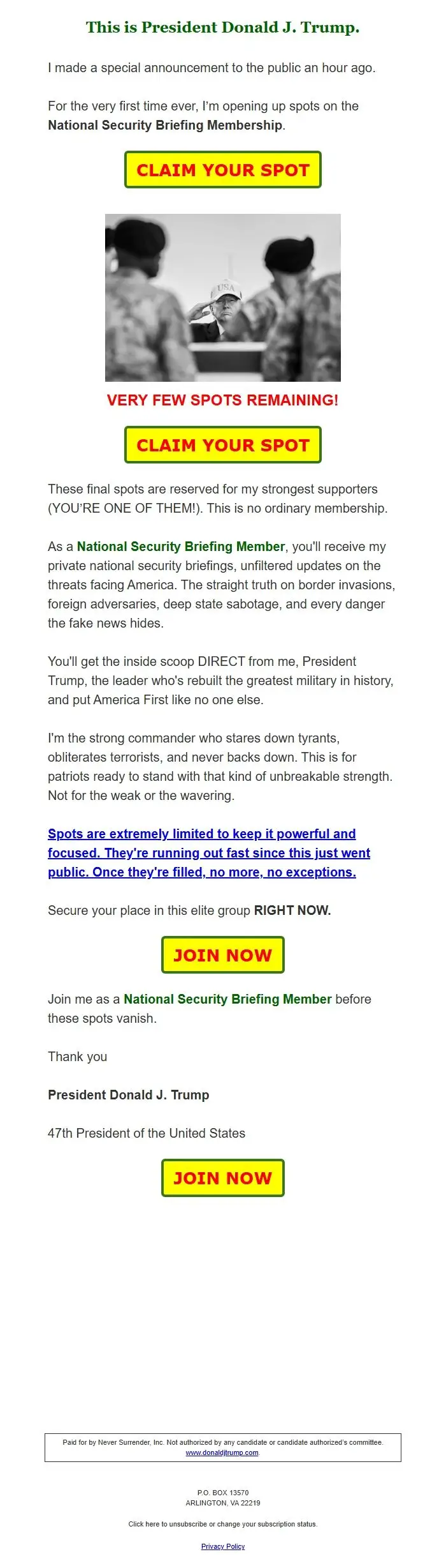 rank | Sat Mar 14 22:49:38 good news, you can now receive Trump's private national security briefings if you donate now... limited spots remaining!!!... that's definitely not a lie!!! portion of the fundraiser email: https://x.com/svdate/status/2032171982364844077/photo/1 (it also using a photo of Trump from the dignified transfer for some weird & indefensible reason) |